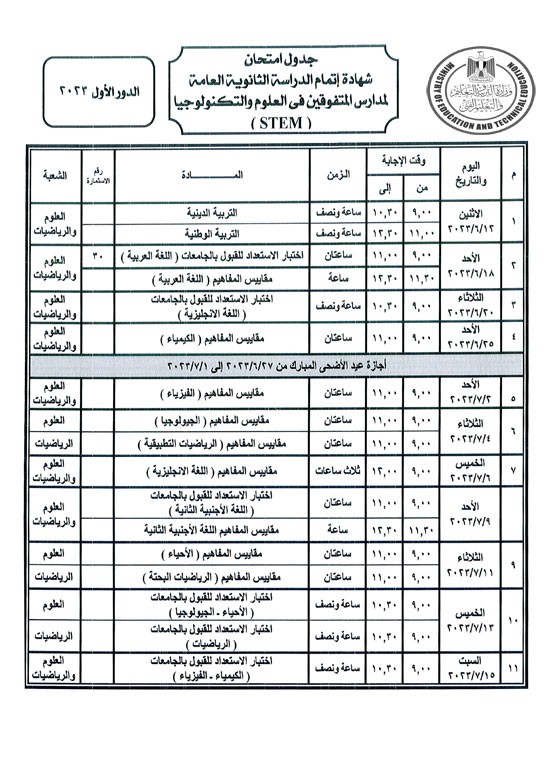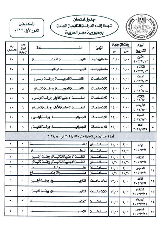 - الأحد 9 يوليو 2023 -> الجيولوجيا والعلوم البيئية لطلاب شعبة علمى علوم والتفاضل والتكامل لطلاب شعبة علمى رياضة وعلم النفس والاجتماع لطلاب الشعبة الأدبية،