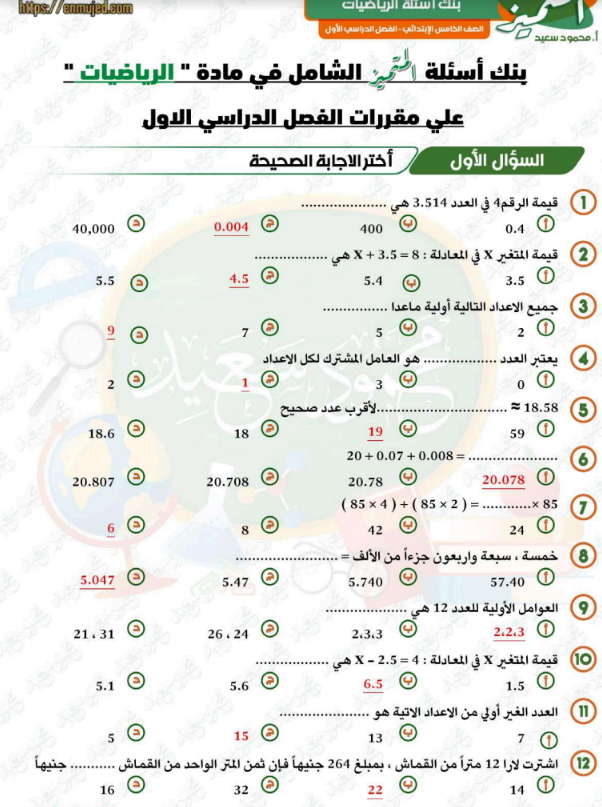 مراجعة المتميز فى الرياضيات الصف الخامس الابتدائي الترم الأول